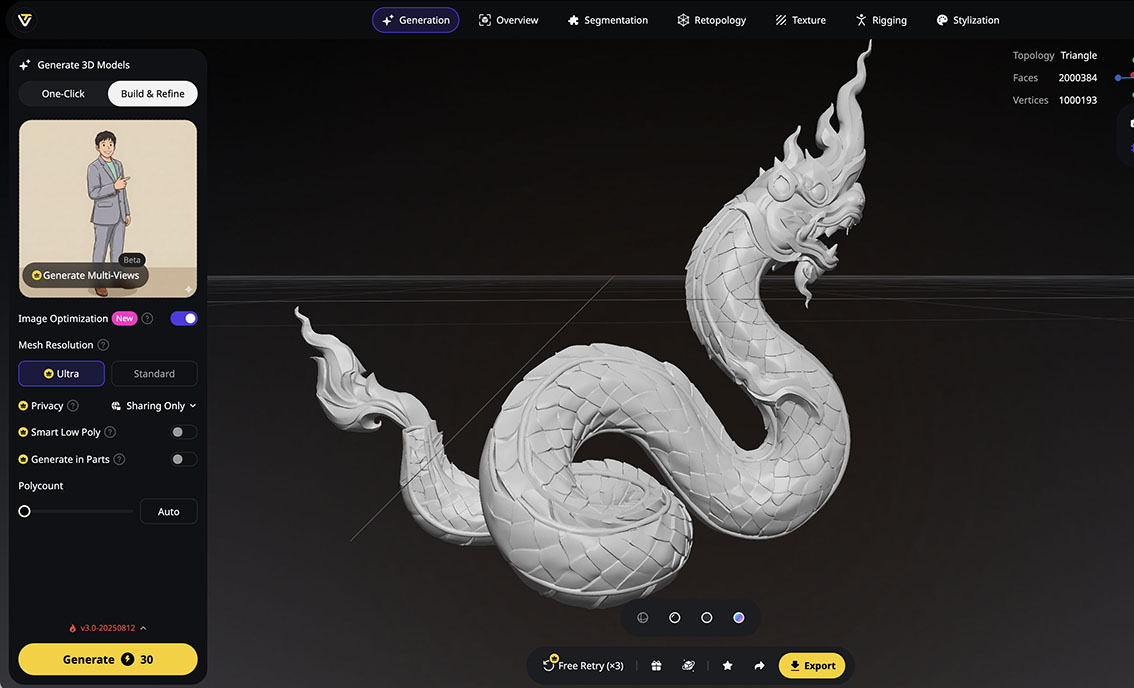 - • หากต้องการรายละเอียดมาก ให้เลือกโหมด "Ultra" ใน Tripo.ai